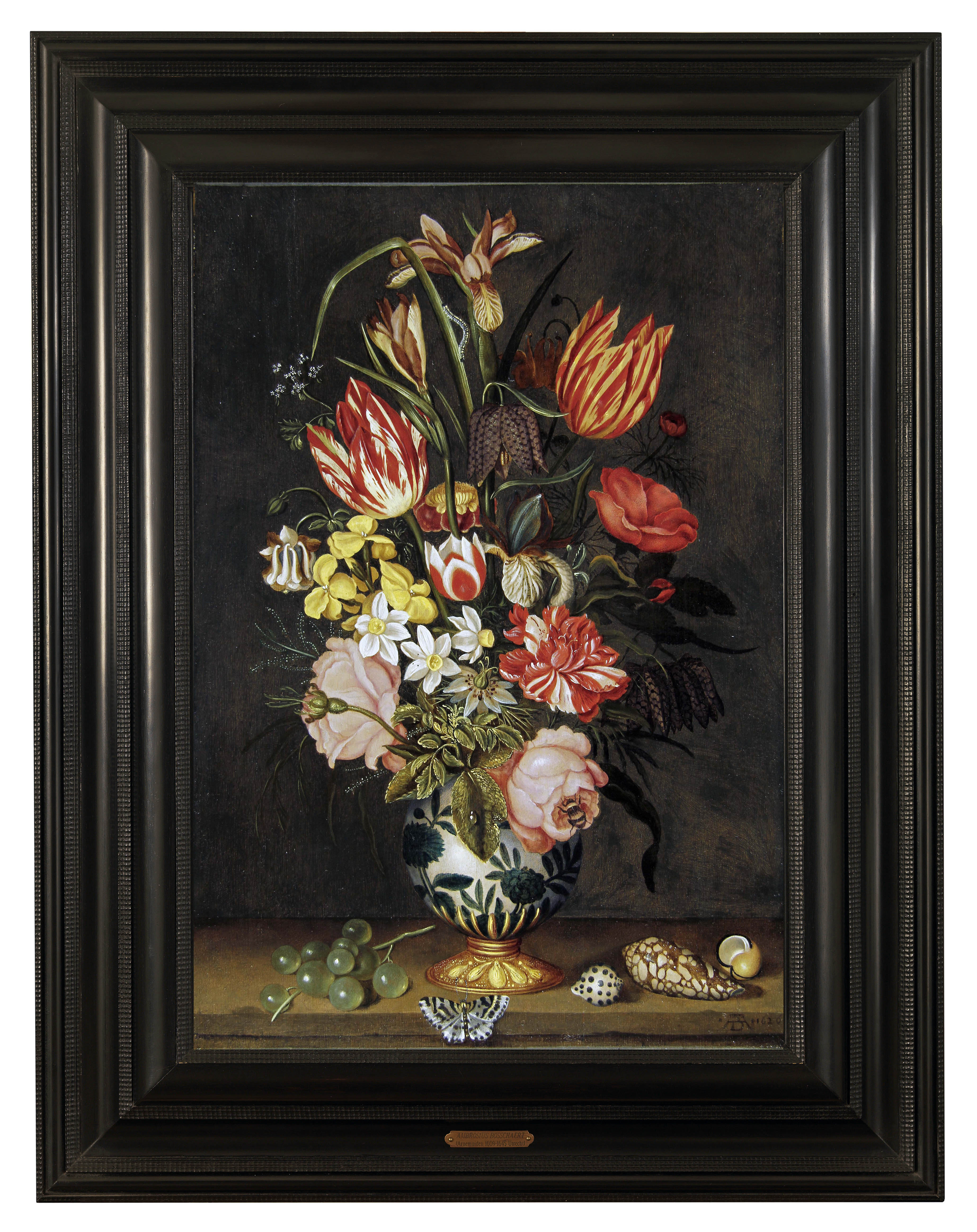 According to Fred G. Meijer in a digital remark at the RKD in The Hague (January 2016) the current picture was probably started by Johannes Bosschaert and finished and signed by Ambrosius Bosschaert II, perhaps after the death of Johannes; some of the flowers, the grapes and the high elevation of the bouquet are characteristic features of the work of Johannes Bosschaert. (RKD image no 0000190914). Dr Sam Segal has identified the various flowers.