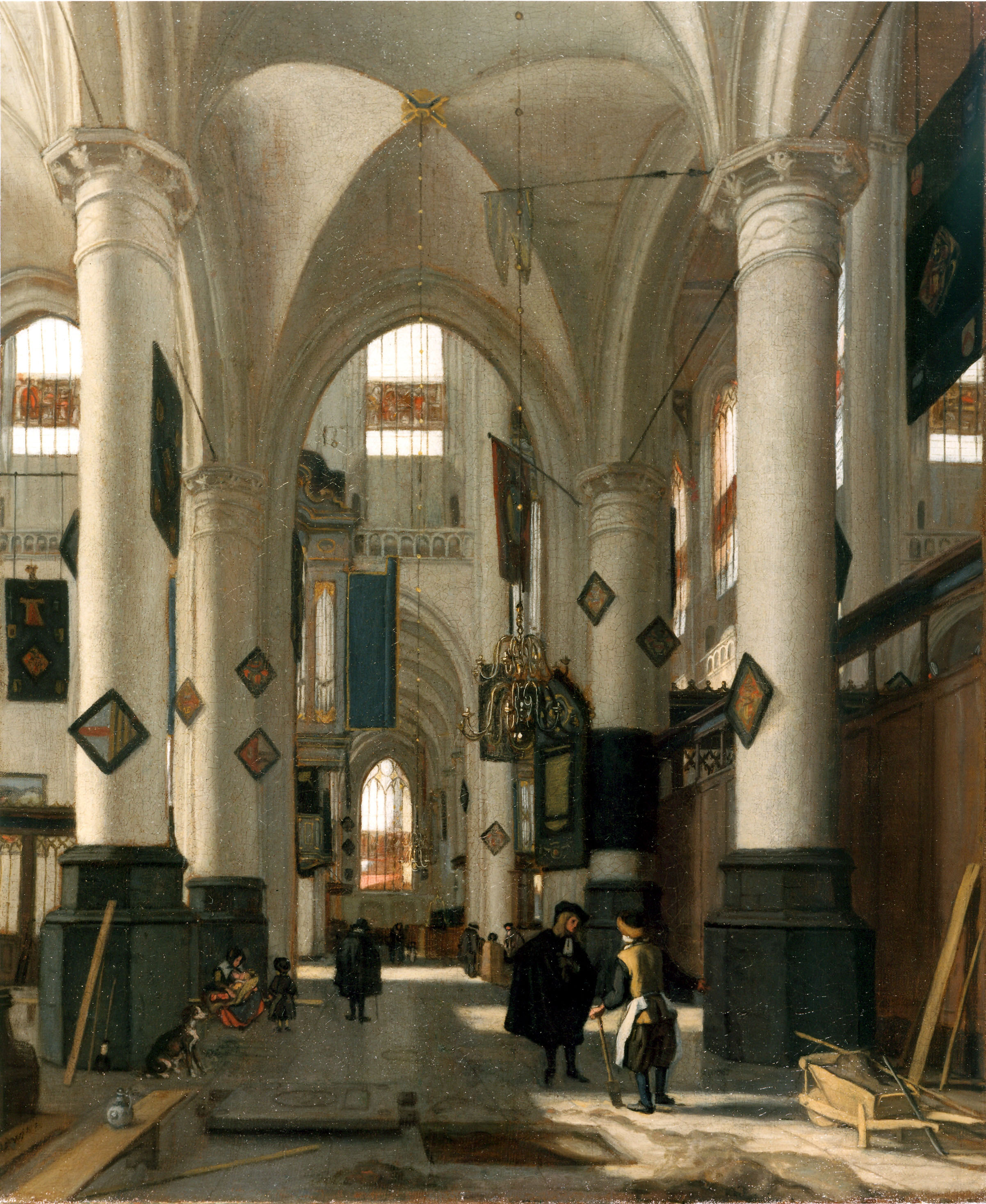 Few details are known of his life, but he was certainly in Alkmaar and joined the guild there in 1636. Six years later, he joined the Delft guild of St. Luke and subsequently married and had two daughters. Originally a figure painter of modest ability, in Delft around 1650 Emanuel de Witte turned to the new subject of local church interiors. He treated Gothic structures less in terms of solid forms or for their specific religious meaning rather than for the space, light and mood. A grave is being dug in the foreground. De Witte often included gravediggers in his church paintings, perhaps as an allusion to the transience of earthly life.