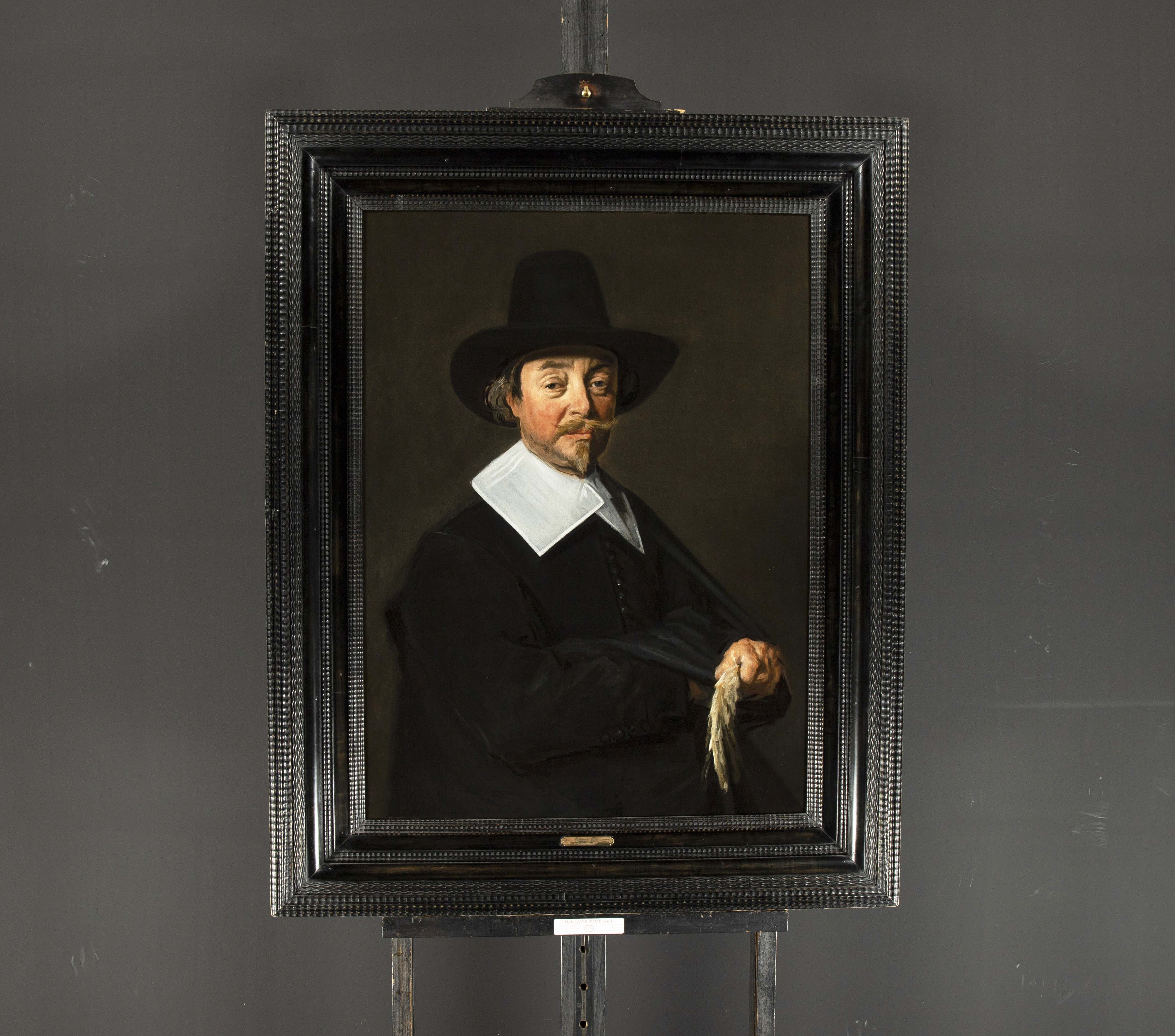 Unfortunately, the identity of the man portrayed is still unknown and hitherto no pendant has been identified, but it has from time to time been suggested that this could be a self-portrait by Hals, on the basis of similarities with the copy of a lost self-portrait of circa 1650 in Indianapolis. The attribute that the man is holding in his left hand may play a role in establishing his identity. It is believed to be a bunch of hops, which could mean that his identity lies among the Haarlem beer brewers. Others, however, see a bundle of tail feathers of a rooster or black cock. Could it be connected to a quill? This could in turn point to a poet, composer, an historian or a writer. What about Constantijn Huygens (1596-1687), the secretary to two Princes of Orange. Around 1645 he would have been at the prime of his career. It is also possible that it is a bundle of linen, which could mean that the sitter was a manufacturer or trader of linen. Or is it an impressionistically stylized glove?