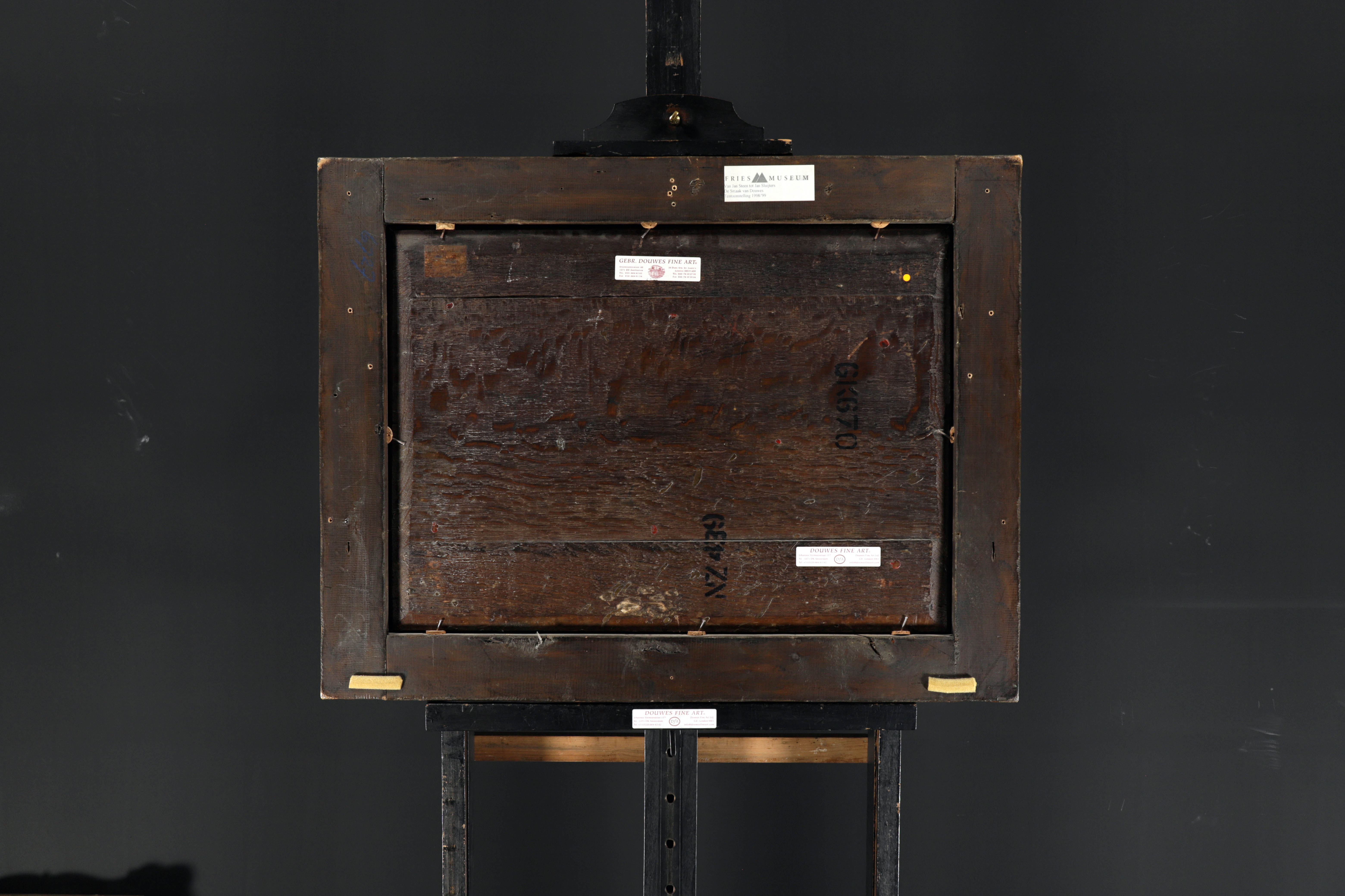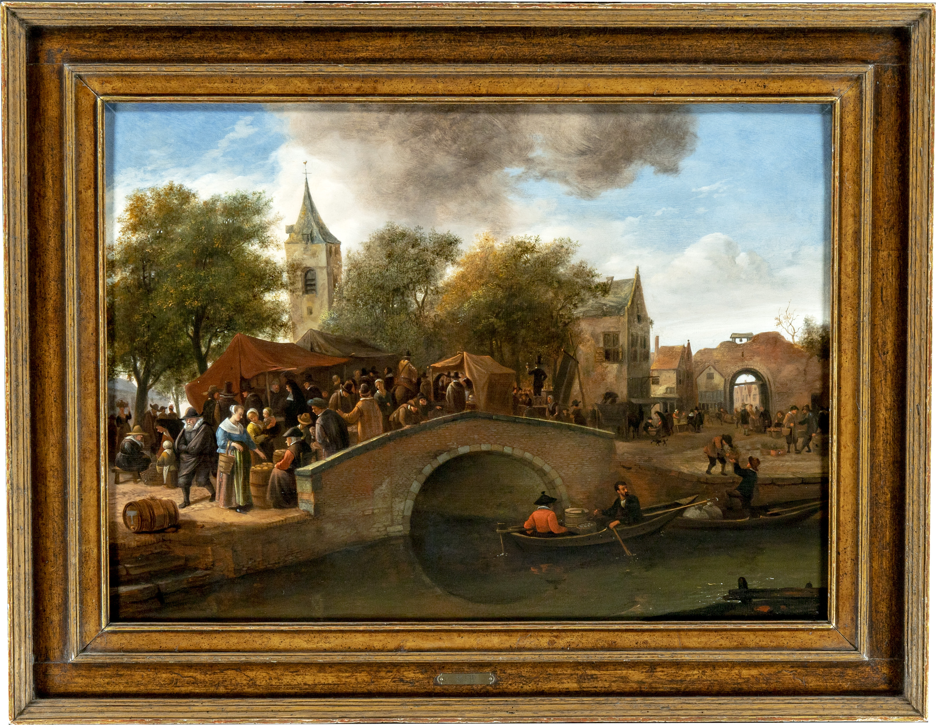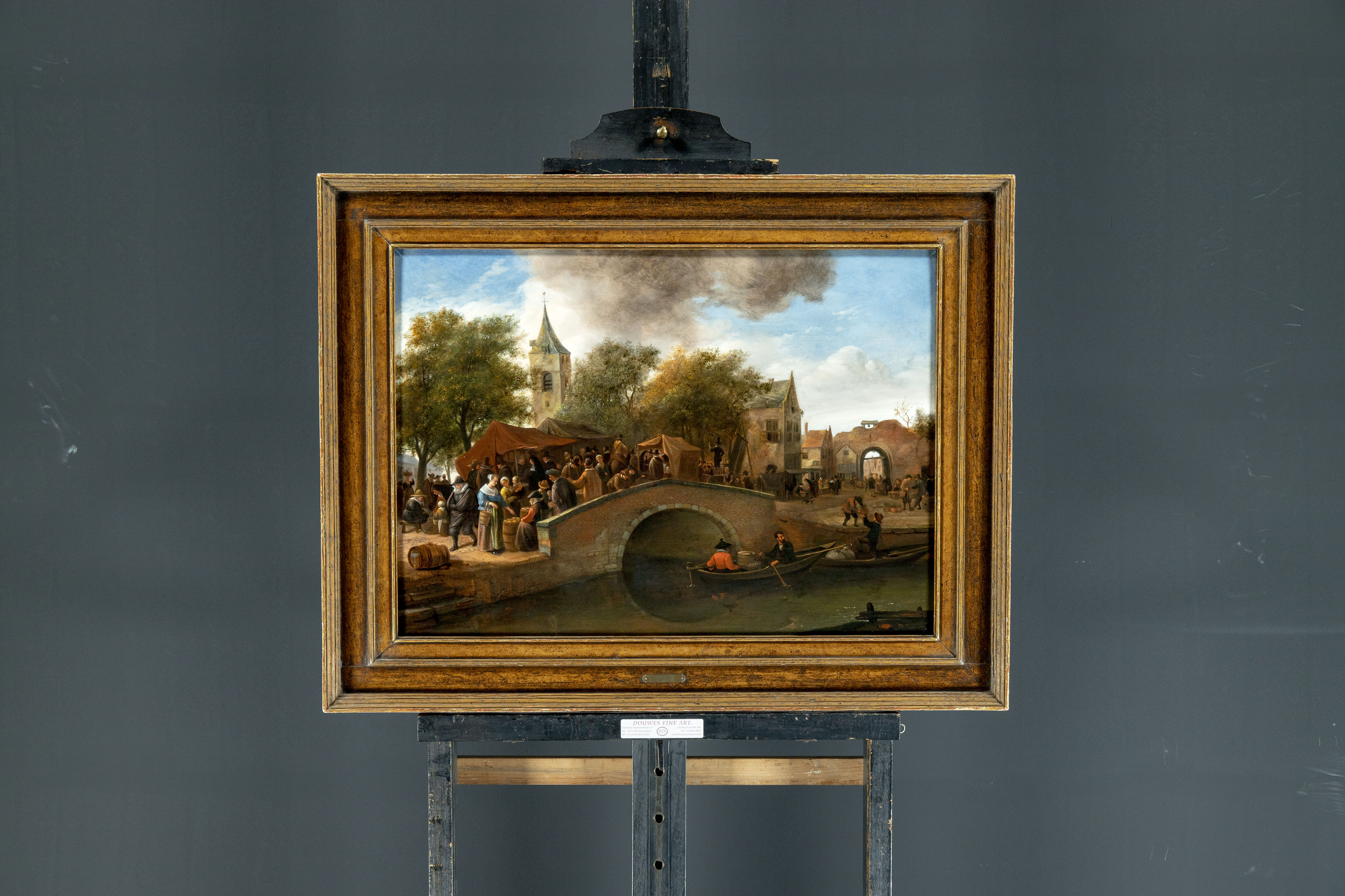 In both drawings we can find the same composition with the church on the left and a bustling fair or market upon the bridge. Merchants are working to load or offload their cargo in the river. It seems Jan van Goyen experimented with different perspectives, as the the bridge is larger and more prominent in no. 384. Just as can be seen in Steen’s painting of the same matter. Perhaps Steen was not even present at said fair but directly copied the composition from his father-in-law’s drawing with the figures given his own interpretation. The overall condition of this picture is very good and remarkable considering its age.
