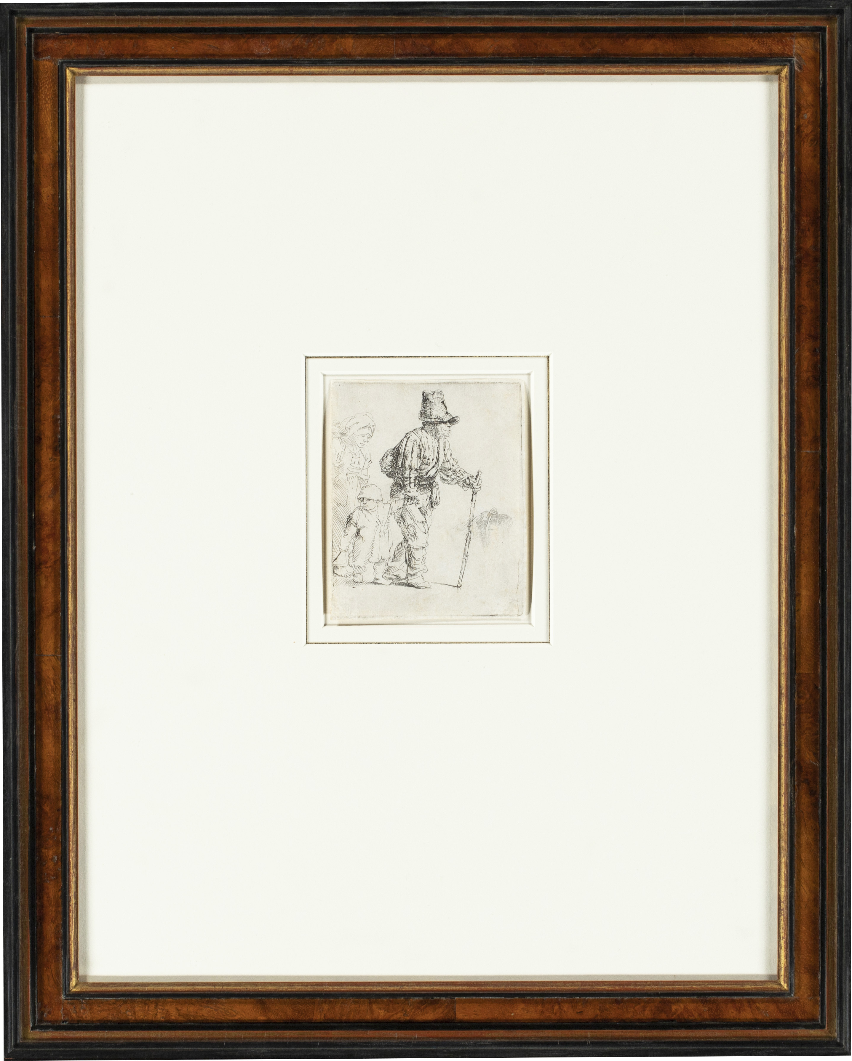 This impression is the first of three states (the only one by Rembrandt), before the correction of foul-biting on the man’s pack, hat and belt, and before the addition of three short vertical lines to his pack. On the right, overlapping with the man’s stick, a lightly etched first version of his head and hat are visible.