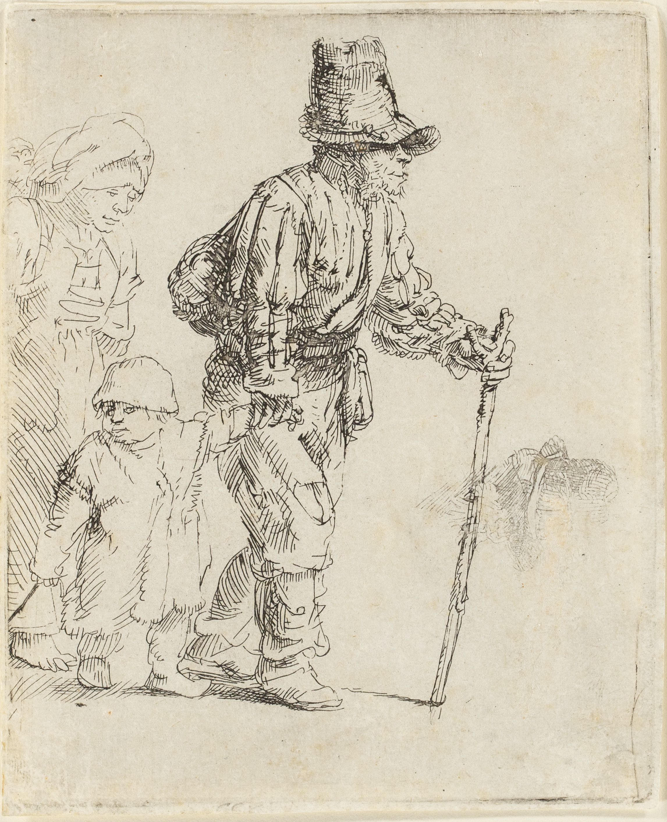 A romantic myth about Rembrandt is that he etched so many beggars – more than thirty etchings in all – because he felt alienated from society himself. It is true that he once portrayed himself as a beggar, but he was more attracted to the expressive faces, tattered clothing, and crumpled gait of these “low” subjects. Unusually for the time, Rembrandt gave his beggars real emotions and individualised faces, seemingly intending to stir compassion in his viewers.
