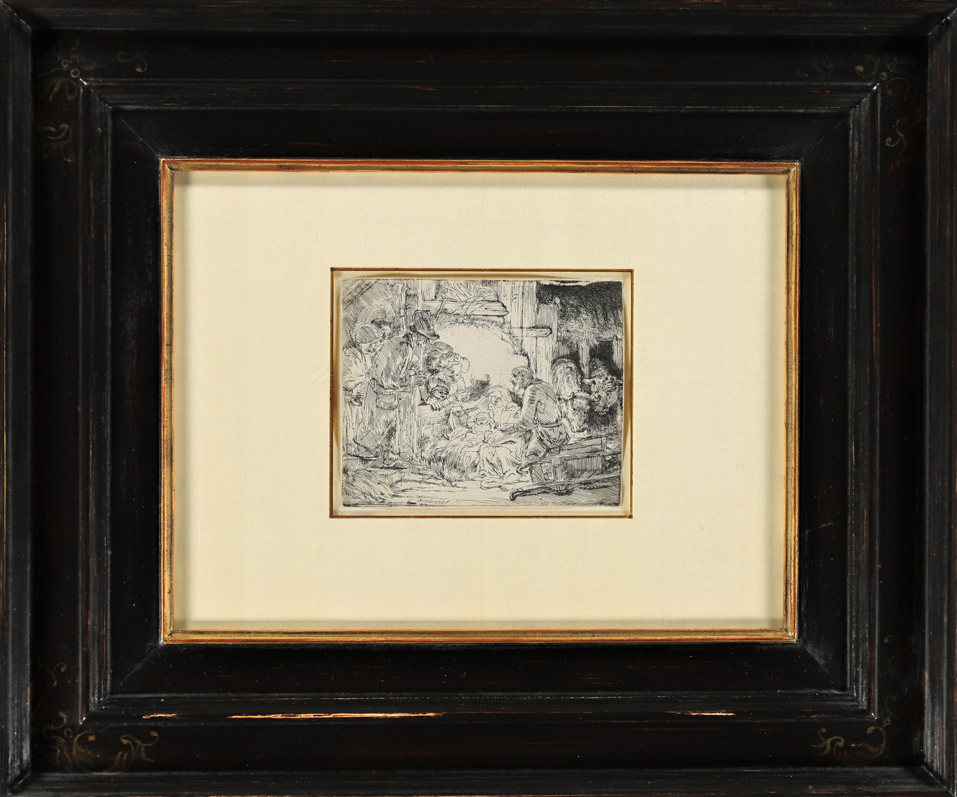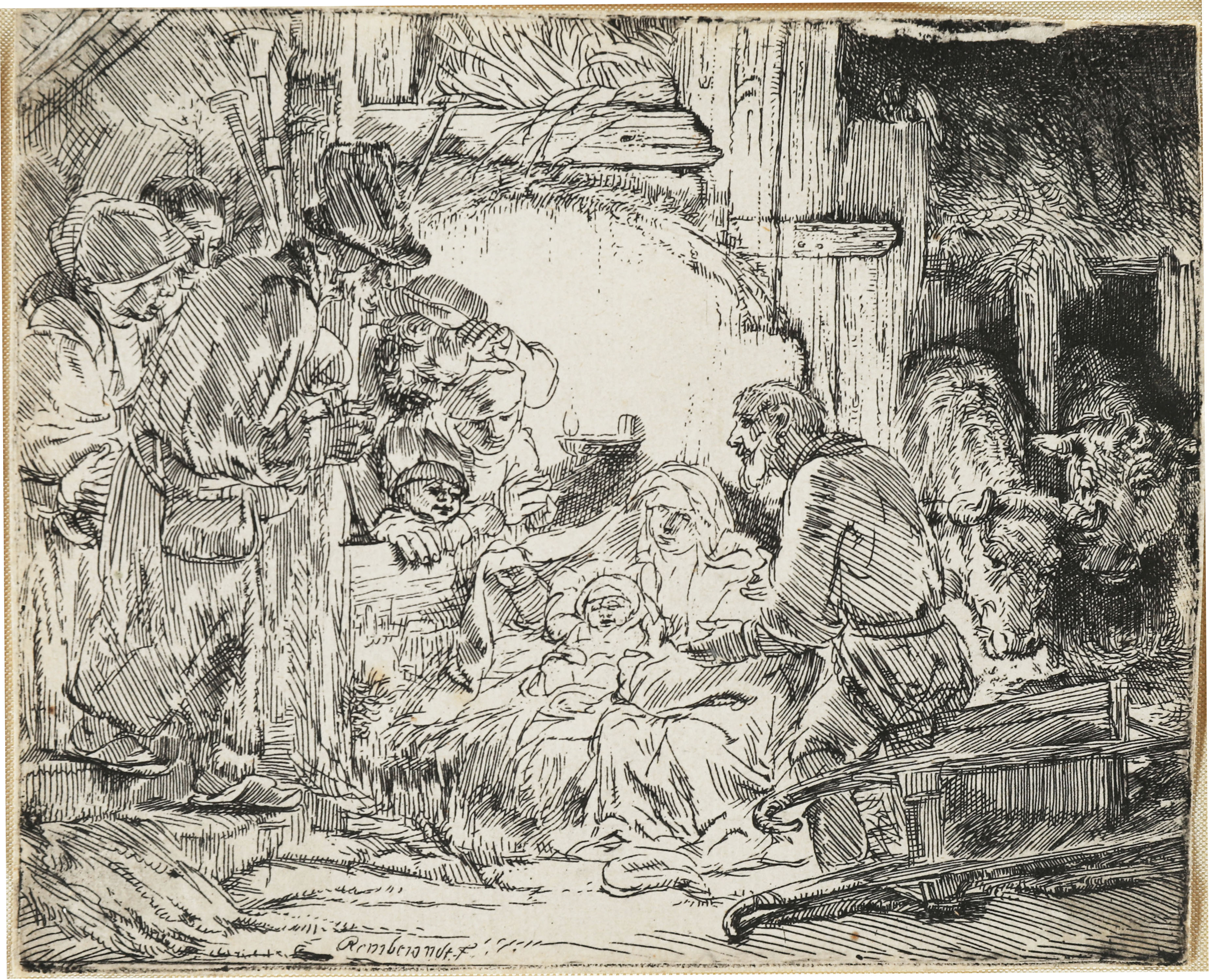 After the announcement of the birth of the Messiah, the shepherds went to Bethlehem, where they found Joseph and the Virgin, and the newborn child in the crib (Luke 2:15-16). The simple, spontaneous manner of etching is well suited to the intimate nature of the scene.