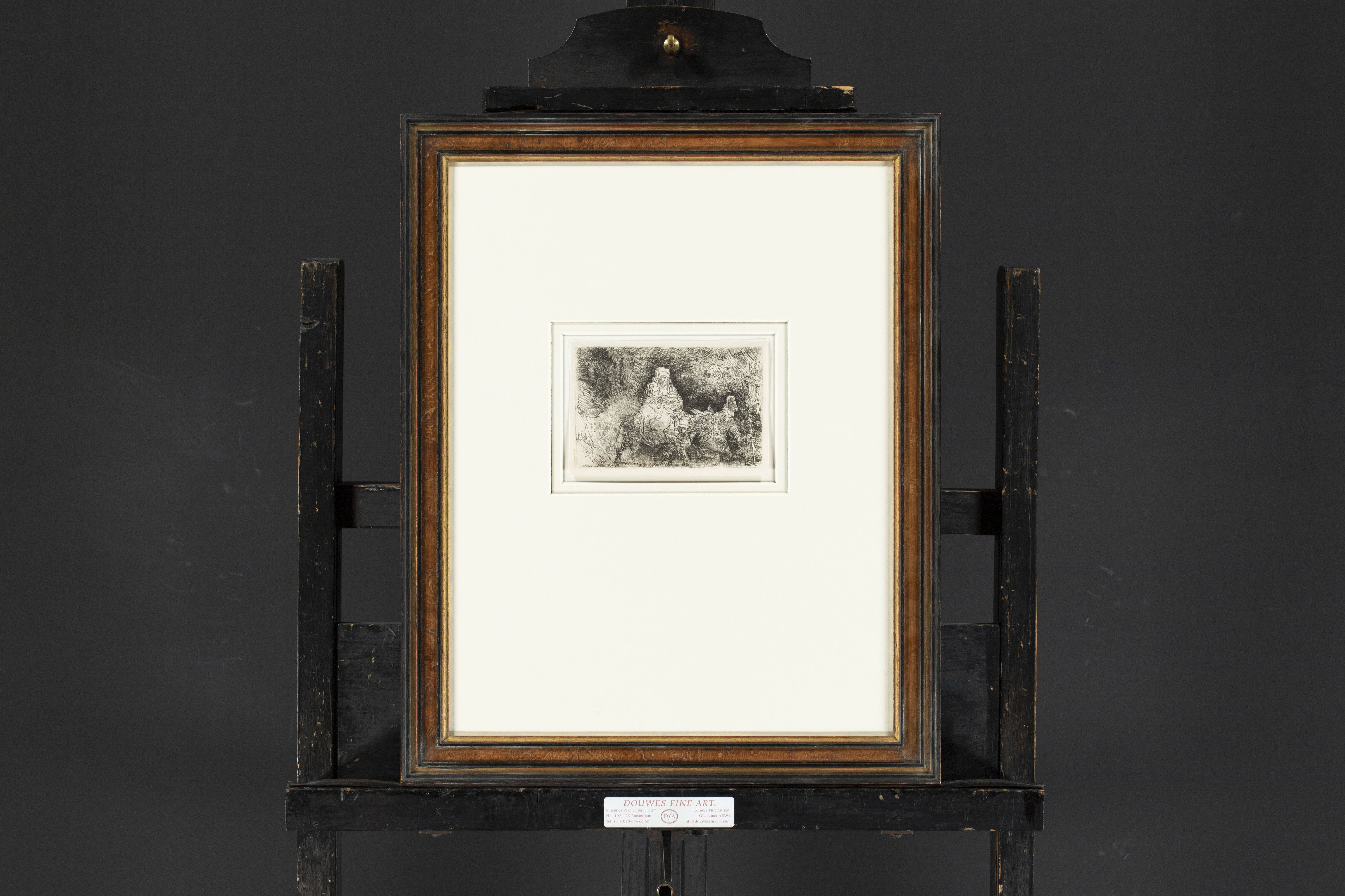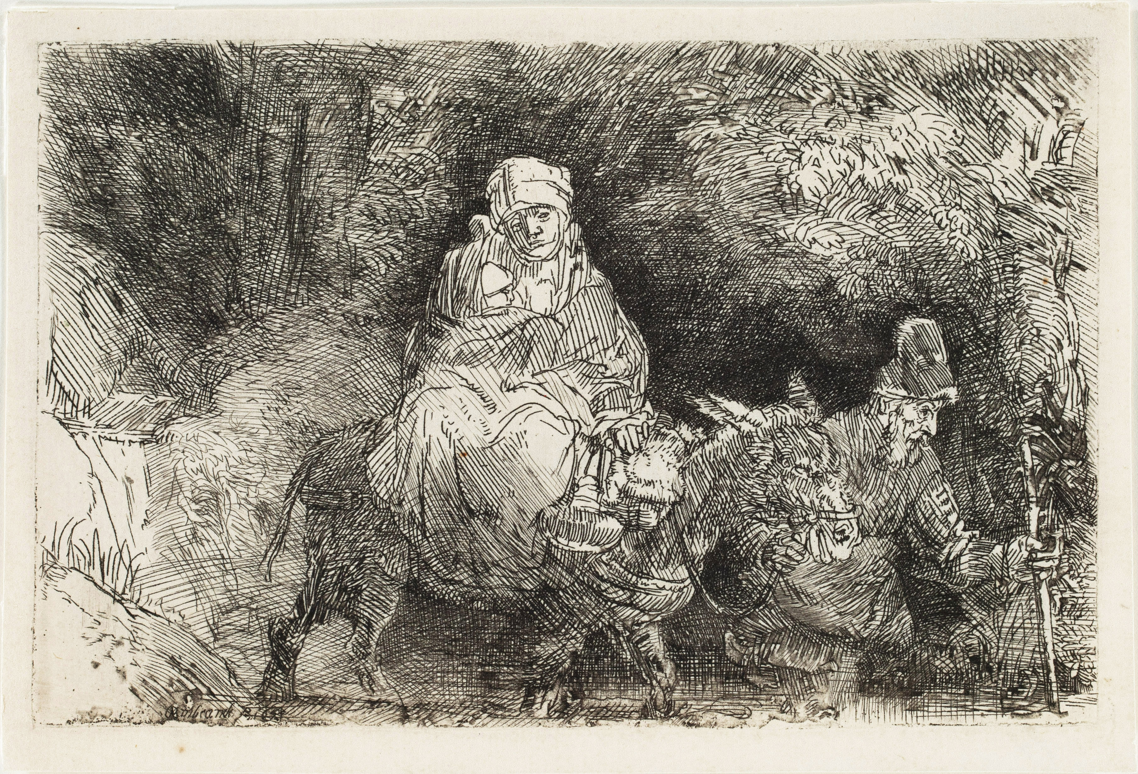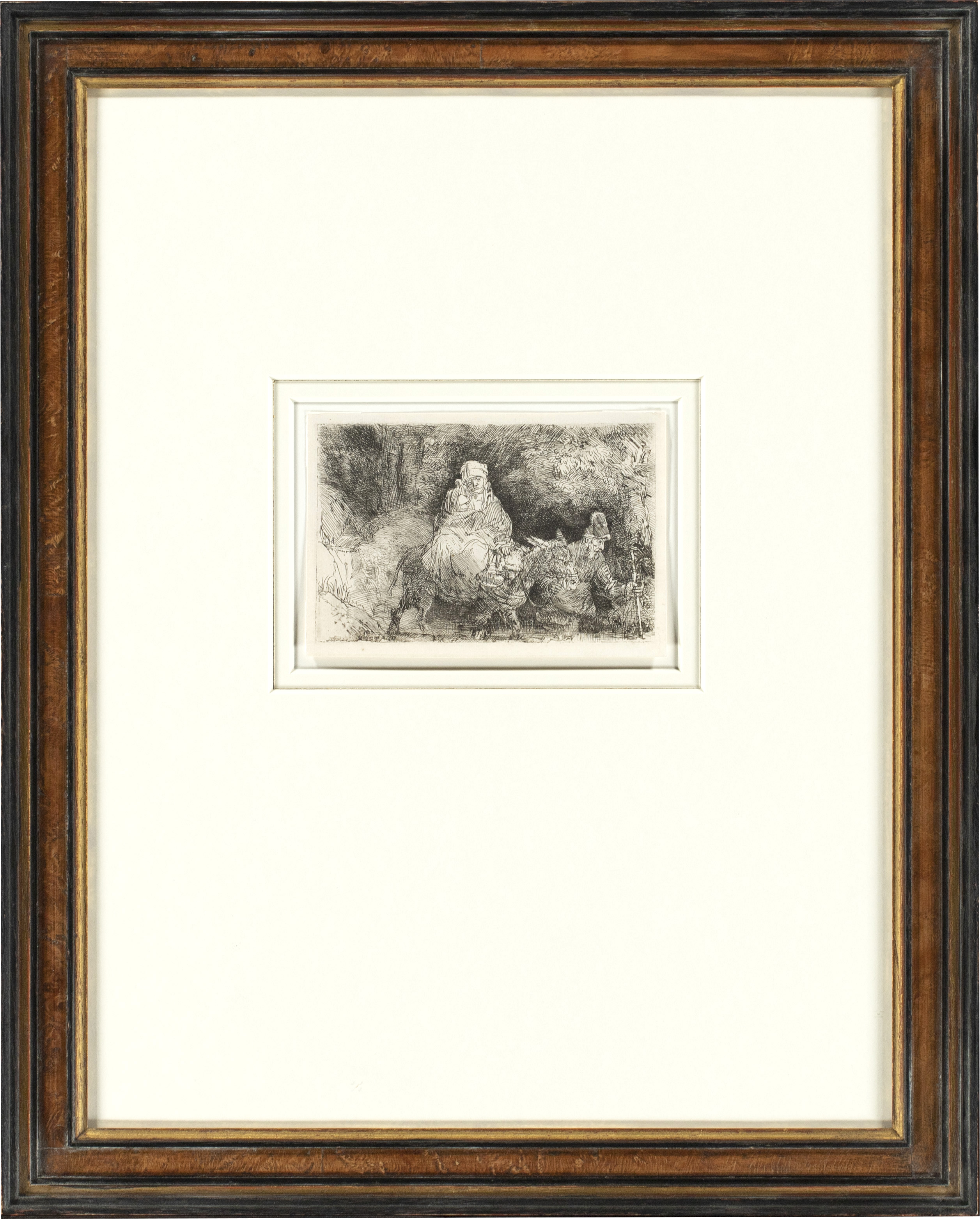 One of a total of eight prints on the theme of the Flight into Egypt or the Rest on the Flight, all of which differ greatly in style, composition and format, the present version demonstrates Rembrandt’s urge to experiment and his success in adapting to different challenges. By loosely applying acid directly onto the plate, a technique called open-bite, Rembrandt created a visual effect which perfectly imitates the fluid nature of the water of the brook at the lower edge of the plate.