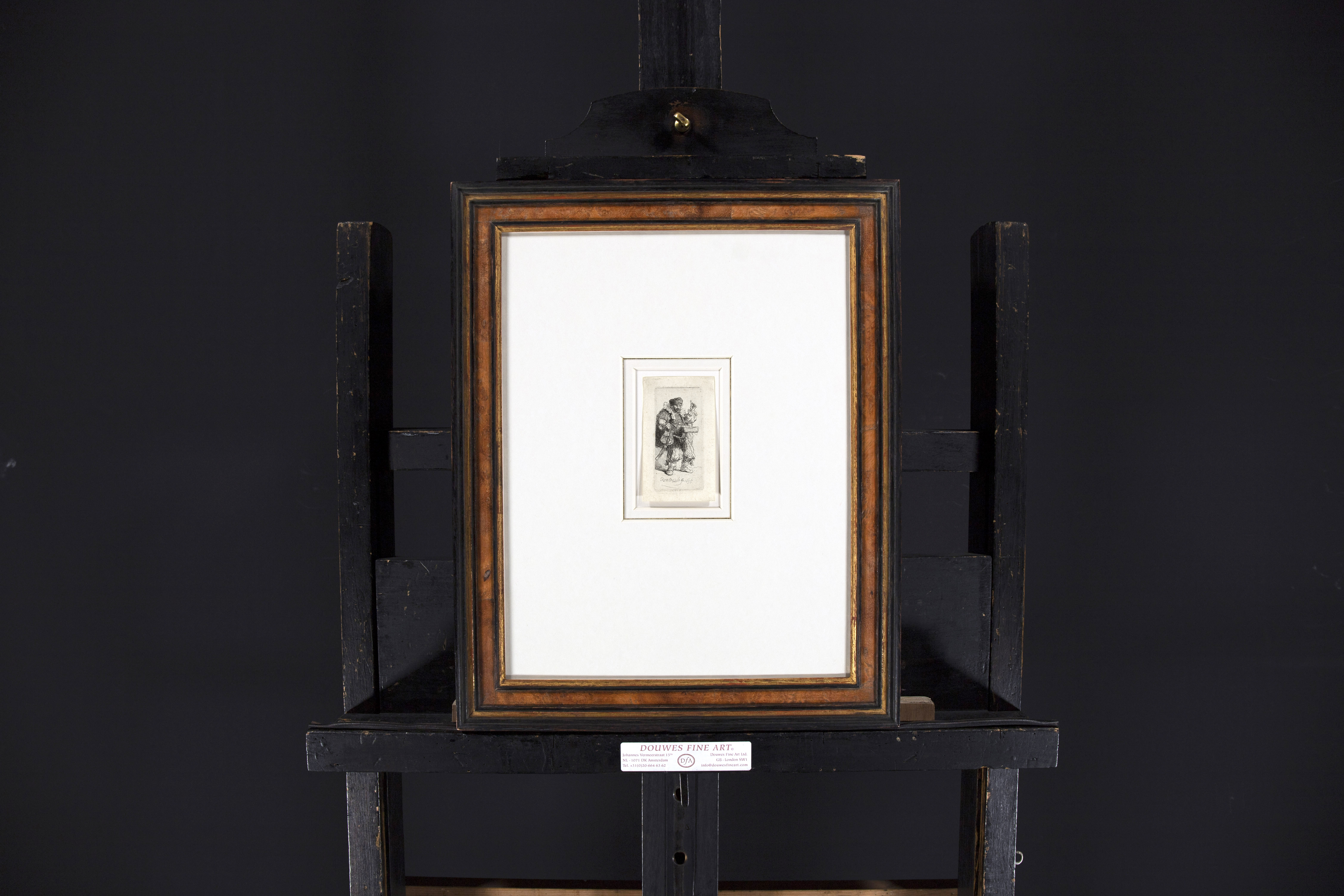 Adam Bartsch (1757-1821), the great expert on prints at the Imperial Court in Vienna, described this etching by Rembrandt as follows: “A tiny piece, engraved with energy and lightness of touch. Its subject is a medicine vendor (“charlatan”), directed towards the right of the print. He holds a basket in front of him, from which he has pulled a packet of drugs that he shows with his left hand. His right hand is placed on his hip, and below hang a shoulder-bag and a sabre. His knees are slightly bent.” Since Bartsch was closer to Rembrandt in time than we are, it seems worthwhile to accept his identification of the subject as a man holding up a piece of paper in which a medicinal powder, or perhaps a solid medicine compacted like toffee, is wrapped for sale to passers-by. Rembrandt lived in Amsterdam, having moved there from Leiden only three years previously, so the man portrayed probably sold medicines on the streets of Amsterdam. After a long period standing up and trying to engage the public, no wonder he wearily bends his knees. Bartsch calls him “un charlatan”, which means someone who speaks out loud the virtues of his wares: Rembrandt depicts him open-mouthed in order to record the impression of the sound as well as the actual sight of this outlandish character.