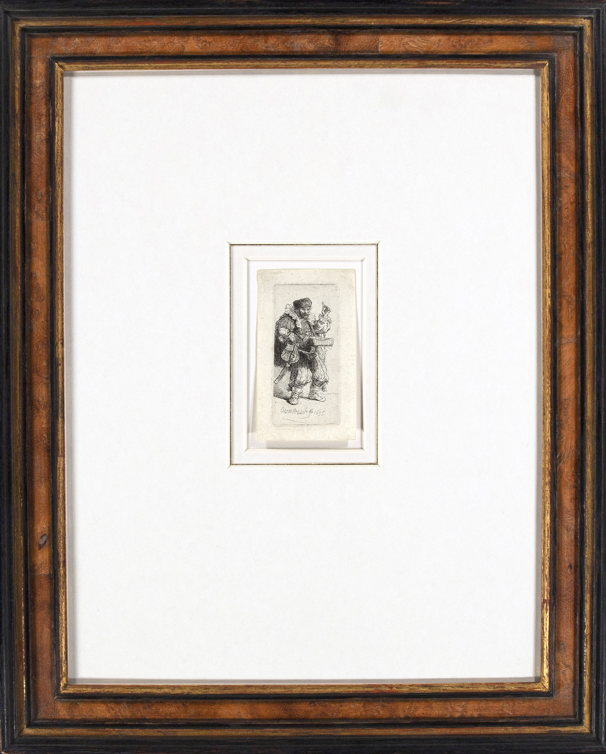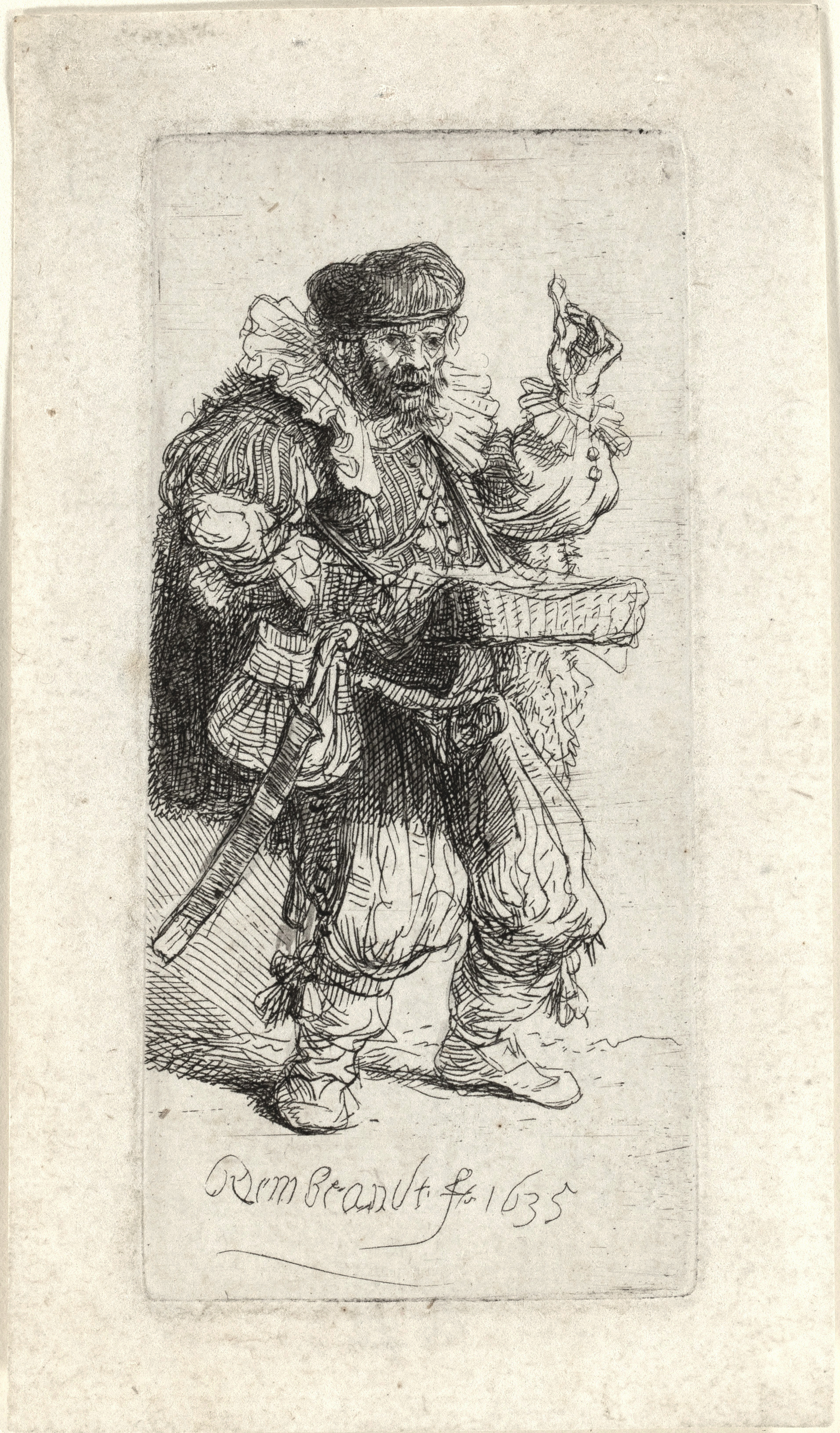 Initially, Rembrandt was fascinated above all by beggards and wretches. Later, he also developed an interest in other colourful city folk, which he usually depicted in the same smaller format. In this print Rembrandt van Rijn makes fun of a man flamboyantly dressed in clothes from an earlier era. The figure wears an elaborate costume of a ruffled collar, fur cloak, knee breeches and a small codpiece and carries a large purse and sword on his right hip. In his left hand he holds up a small object for the perusal of passersby. The man is a quacksalver, depicted hawking his medicines in the streets.