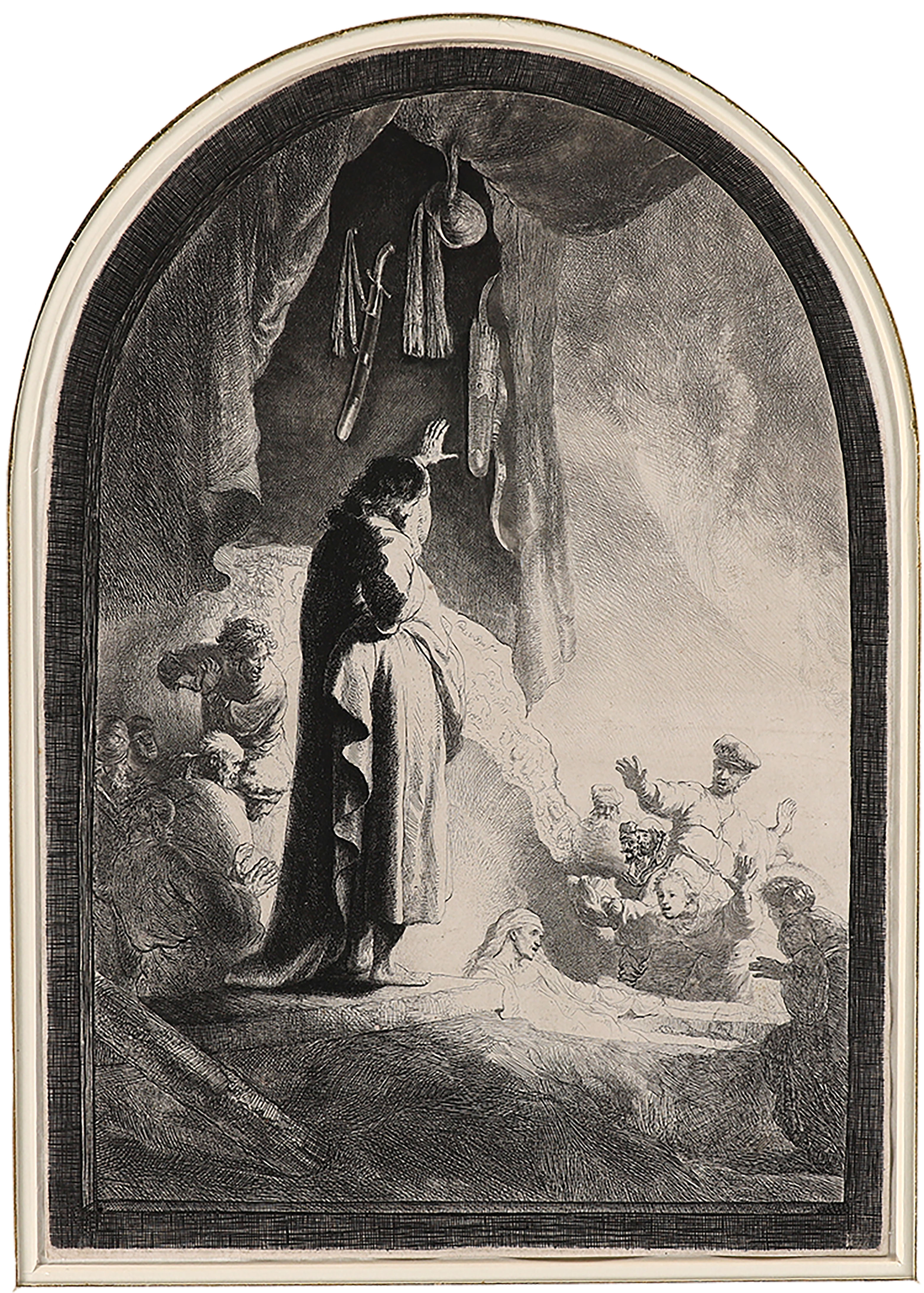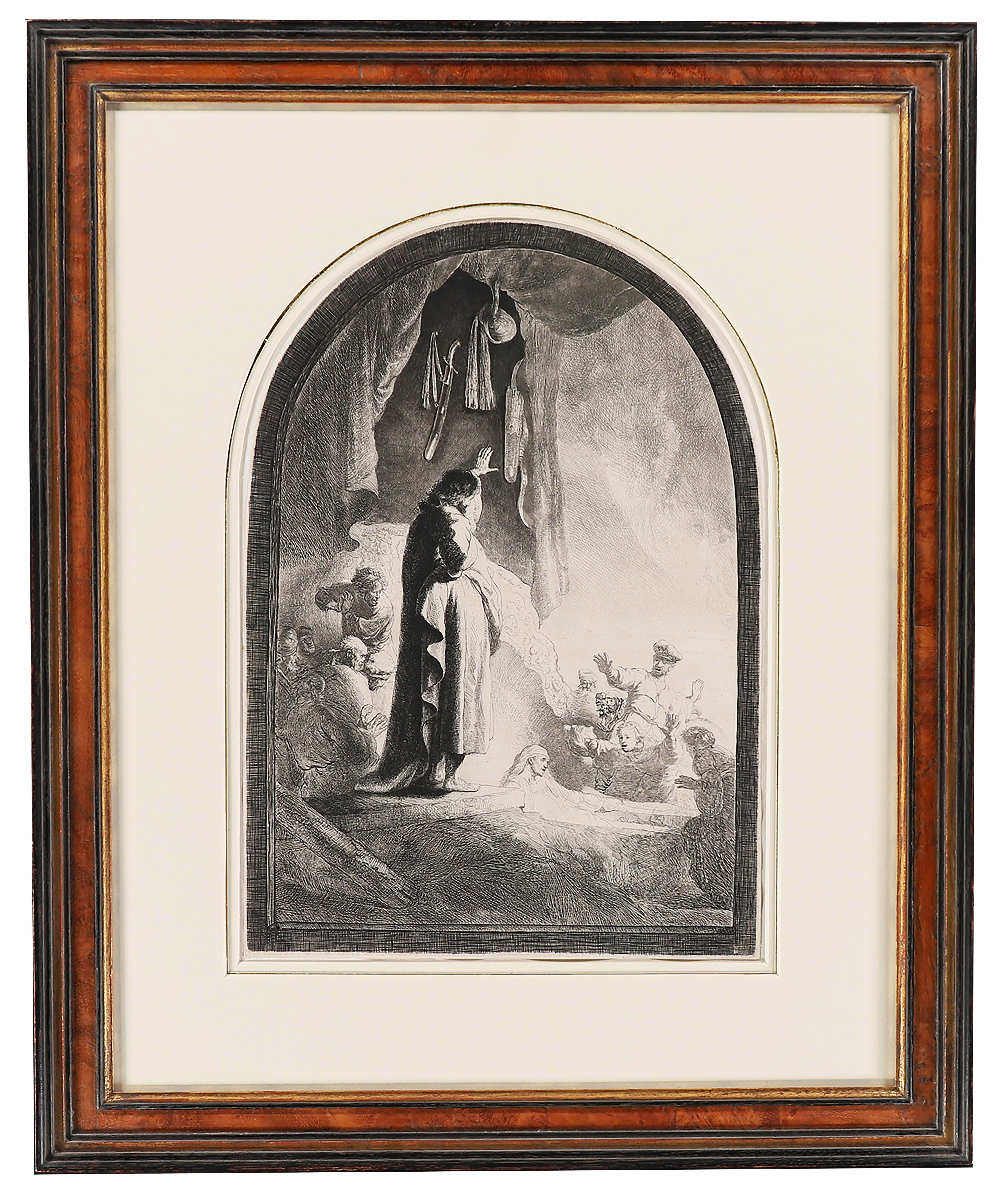 Rembrandt van Rijn often revisited this important biblical subject, in which Christ foreshadows his own death and resurrection by reviving the dead Lazarus. The artist produced several versions of this scene from different vantage points. In this dramatic, arched composition, both the viewer and the onlookers wait inside the burial cave. Christ turns his back to the viewer, and as he raises one hand in a ray of blinding light, Lazarus begins to emerge from his grave.