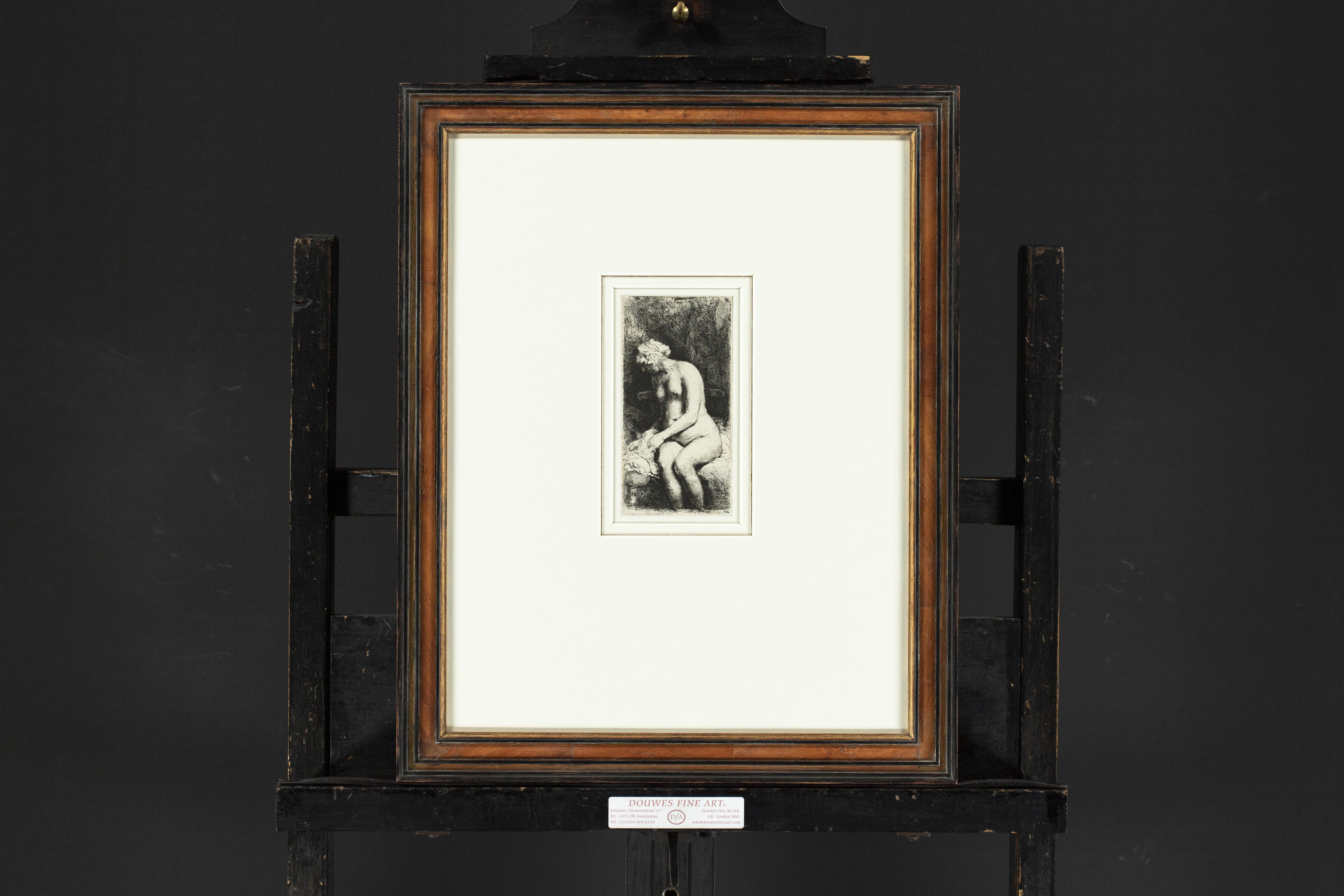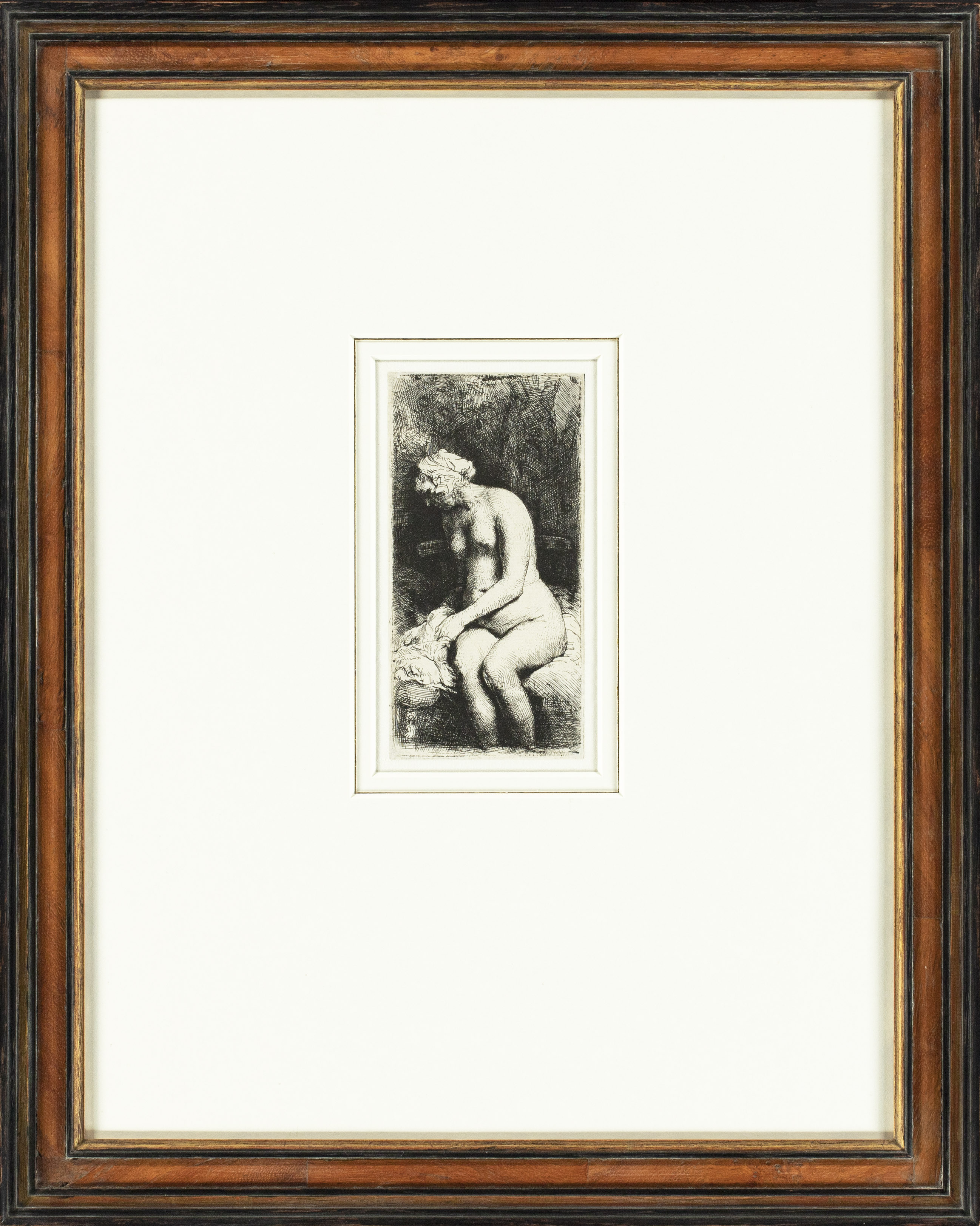 In 1658 Rembrandt created several enigmatic, tonal etchings of women, presumably sketched directly from nude models. Each hints at a setting or subject, although the artist no doubt meant them to be open to interpretation. In this case, the fact that he did not show the woman’s feet suggests that he intended them to dangle in water; a few clumps of leaves are distinguishable in the dark background. Curiously, however, he also depicted a large cushion and what seems to be the backrest of a chair.