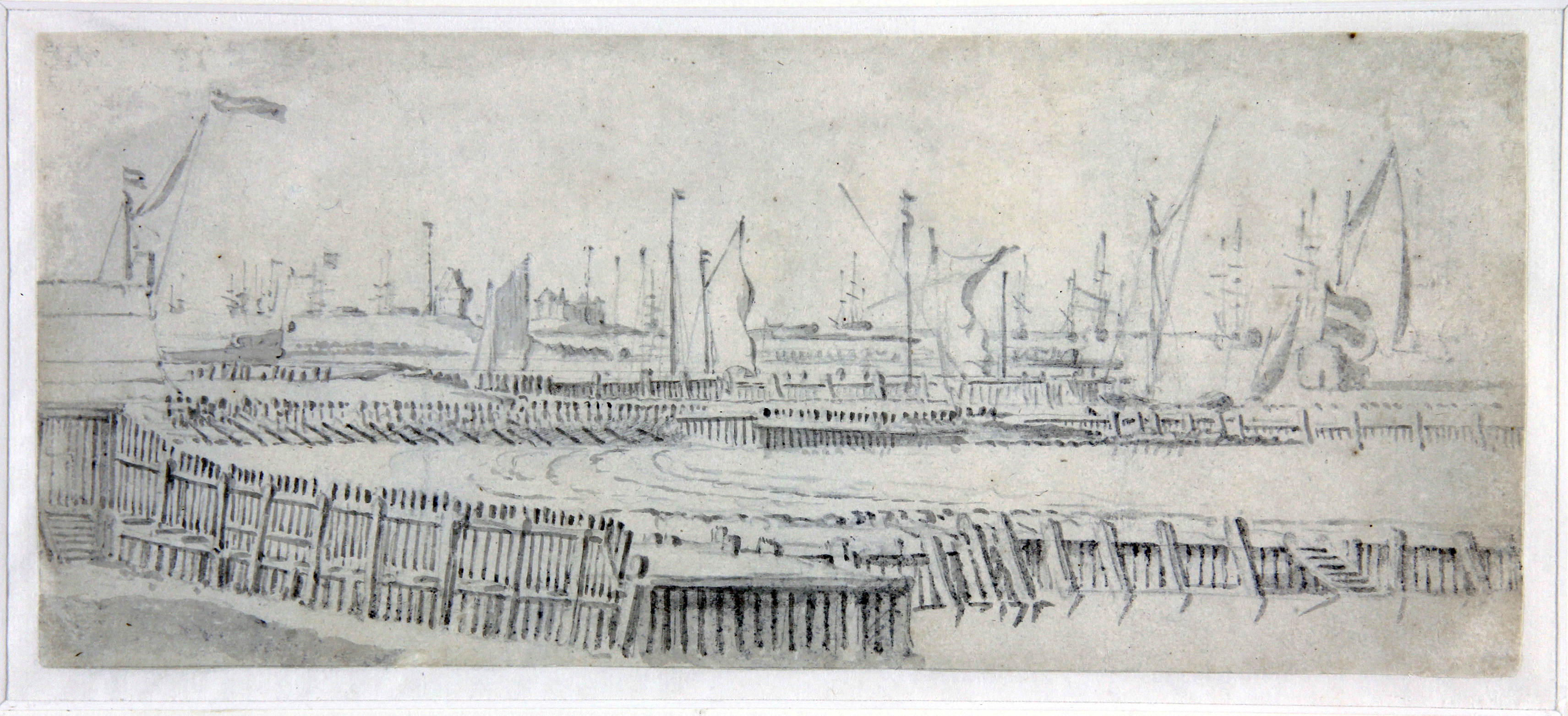 Willem II was a draughtsman throughout his career and he continuously executed highly detailed renderings of ships and scenes as studies for his paintings. The present view can be compared with other similar views by Van de Velde that depict fleets at the entrance to the Texel, near Den Helder. Two examples are in the great collection of drawings by the Van de Veldes in the Boijmans Van Beuningen Museum, Rotterdam, and another was recently sold in London. Unlike those drawings, though, the present work includes quite a number of buildings in the background – surely Den Helder, which was the only significant settlement in that remote part of the North Holland peninsula. Den Helder, the Texel and the nearby islands were locations of immense importance for the Dutch fleet, and multiple fortifications were built in this area.